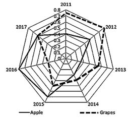 Following radar graph shows the ratio of exports to imports of two fruits Apple and Grapes over the period 2011 to 2017.