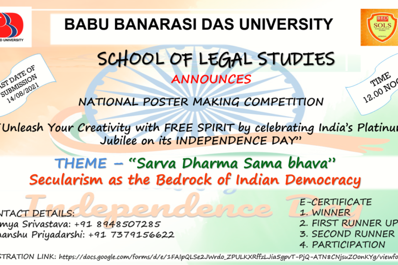 School of Legal Studies, Babu Banarasi Das University is Organizing National Poster Making Competition on the theme “Sarva Dharma Sama Bhav” Secularism as the bedrock of Indian Democracy.
