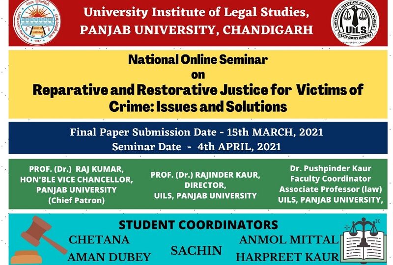 University Institute of Legal Studies, Panjab University, Chandigarh is organizing a National Seminar on Reparative and Restorative Justice for Victims of Crime: Issues and Solutions under the guidance of Prof. (Dr.) Rajinder Kaur, Director, University Institute of Legal Studies, Panjab University, Chandigarh and Dr. Pushpinder Kaur, Associate Professor (Law), University Institute of Legal Studies, Panjab University, Chandigarh.