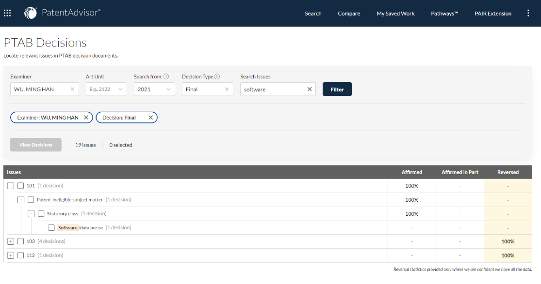 PTAB Decisions search in the PatentAdvisor analytics platform features over 111,000 ex parte appeal documents, since 2007, tagged to 217 legal issues, enabling prosecutors to easily find winning arguments and get more accurate and relevant prosecution guidance. PTAB Decision data reveals the substance behind the statistics to guide specific response strategy and gives insights into additional information about examiner behavior that is beneficial throughout all stages of the prosecution process. The dataset will be continuously updated and tagged with the relevant issues using AI-supported algorithms and validated by patent experts.