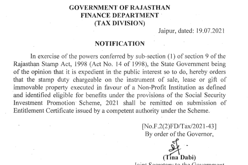 To Promote Social Investment in the state of Rajasthan Rajasthan Government on 19th July 2021 issued notification regarding exemption from Stamp Duty and Registration fee chargeable on the instrument of sale, lease or gift of immovable property executed in favour of a Non-Profit Institution. There are two separate Notifications for Stamp Duty and Registration Fee exemption to NGO, Only those institutions which Obtain Entitlement Certificate from Government will be exempted under this notification.