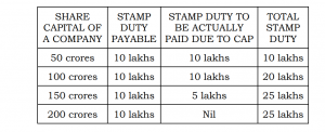 “In other words, the ceiling of Rs. 25 lakhs in Column 2 is applicable on Articles of Association and the increased share capital therein, not on every increase individually. In case stamp duty equivalent to or more than the cap has already been paid, no further stamp duty can be levied. For a better understanding, let us consider a hypothetical example:”