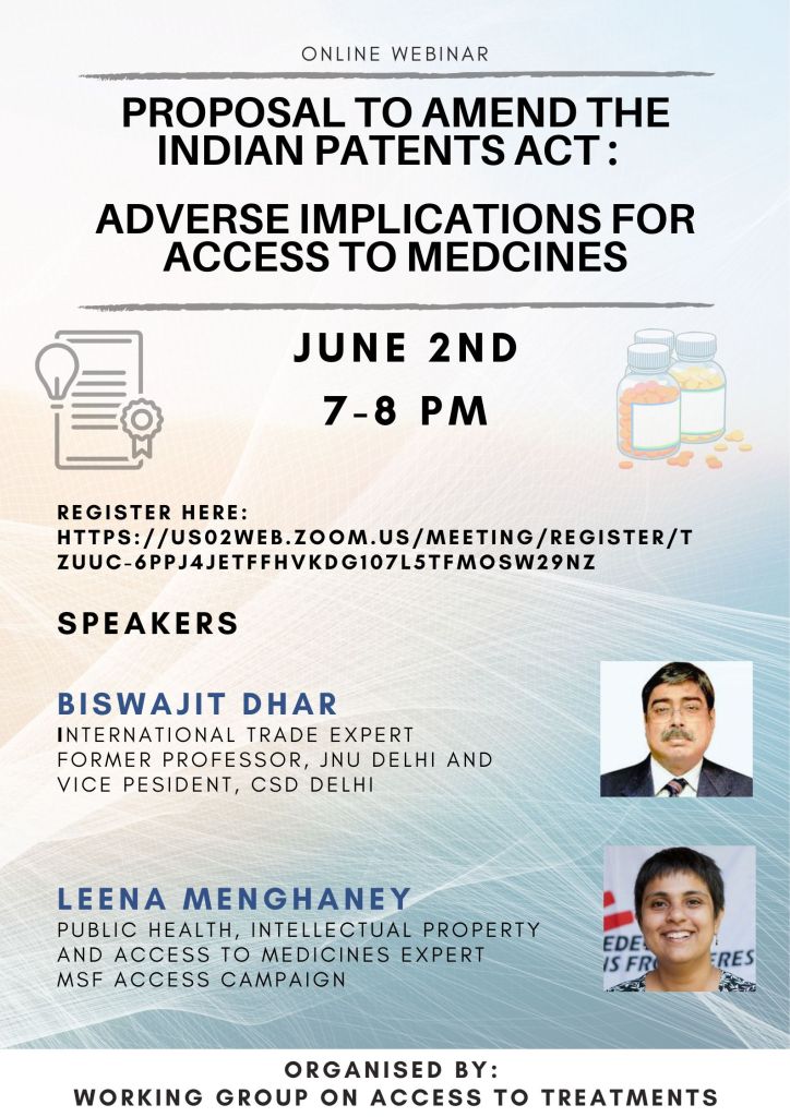 We’re pleased to inform you that Third World Network and the Working Group on Access to Medicines and Treatments would like to invite you to a webinar on “Proposal to Amend the Indian Patents Act: Adverse Implications for Access to Medicines” to raise awareness on the potential implications of the proposed amendments to the Patent Act. For further details, please see the announcement below: