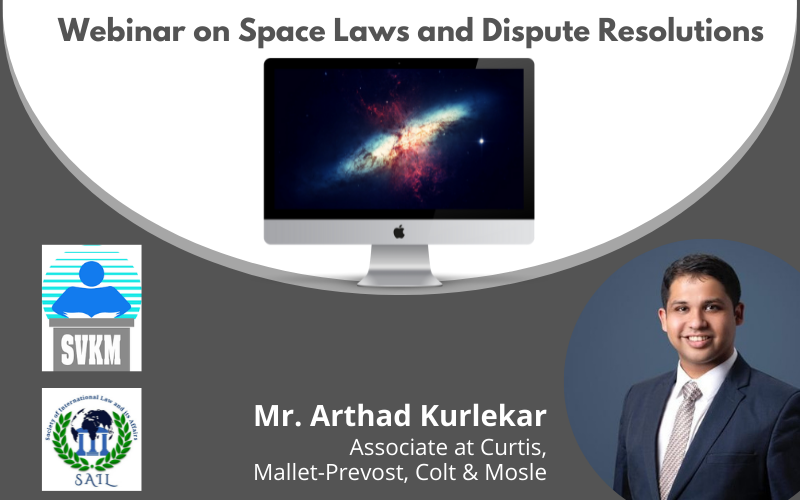 The Webinar on ‘Space Laws and Dispute Resolutions’ by Mr. Arthad Kurlekar organised by SVKM’s Pravin Gandhi College of Law (PGCL) is scheduled for August 4 2021 which will cover the space treaties, principles and dispute resolution mechanisms within the treaties and certain concerns on dispute resolution of outer space contracts.