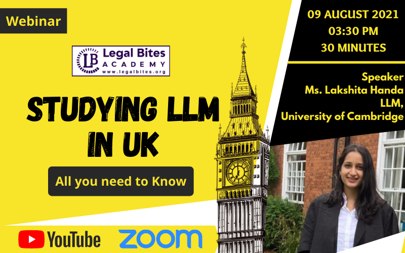 Legal Bites is organising a FREE webinar on “Studying LLM in the UK – All you Need to Know”. The webinar will be held Online on 9th August 2021. Register now!