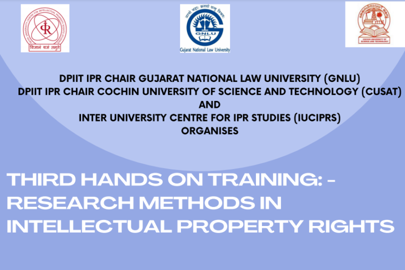 The workshop on ‘Research Methods in Intellectual Property Rights’ aims to impart training for properly conducting research, and analyses the results of empirical study to support the findings in IPR policy research. The workshop is jointly organized by DPIIT IPR Chair, Gujarat National Law University (GNLU), DPIIT IPR Chair, Cochin University of Science and Technology (CUSAT), and Inter-University Centre for IPR Studies (IUCIPRS). The Workshop is designed for PhD. Scholars in Intellectual Property (IP) Law, Academicians and Post Graduate law students of IP.