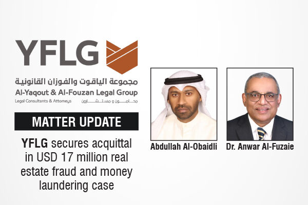 The Kuwaiti corporate law firm, Al-Yaqout & Al-Fouzan Legal Group (YFLG) successfully secured the acquittal of a businessman in criminal proceedings involving allegations of money laundering and real estate fraud amounting to approximately USD 17 million. The acquittal, originally granted by the Criminal Court at first instance, was upheld by the Court of Appeal.