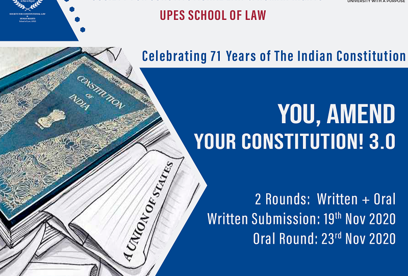 Society for Constitutional Law & Human Rights, established under the aegis UPES School of Law is celebrating 71 years of the Indian Constitution. In this furtherance, SCLHR presents to you all, “You, Amend Your Constitution 3.0”. The objective is to provide an opportunity for the students to propose amendments to the Constitution based on their rational thoughts and to defend it. The competition is divided into two segments, the first being the written submission followed by oral arguments.